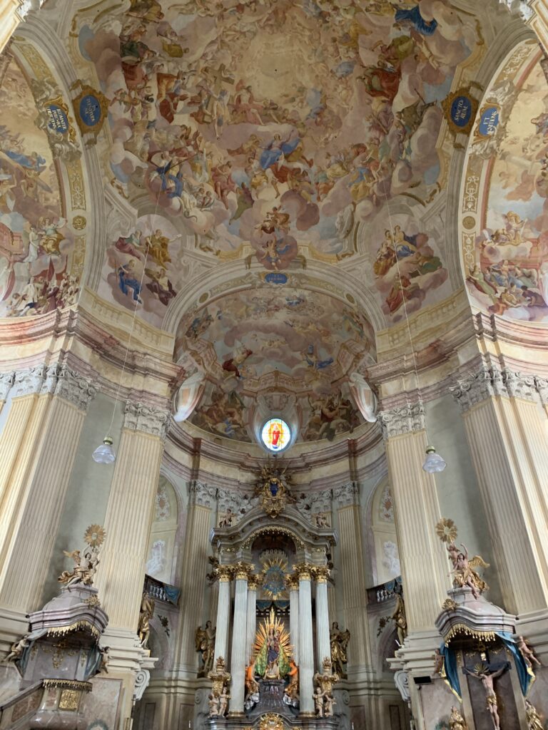 Nazajutrz ruszyliśmy w stronę wspomnianych jaskiń. Zanim tam jednak dotarliśmy naszą uwagę zatrzymał potężny kościół w miejscowości Krtiny. „Skąd w tak małej wsi tak potężny kościół…?”  Sprawa się szybko wyjaśniła: Chrzściny (bo tak trzeba by przetłumaczyć nazwę miejscowości) to miejsce pielgrzymek maryjnych Czechów (a przynajmniej było, gdy jeszcze był to naród wierzący…). Z dawnej świetności został właśnie monumentalny kościół p.w. Imienia Najświętszej Maryi Panny projektu Santiniego. Oprócz tego w Krtinach zwiedzić można jeszcze zamek oraz ogród dendrologiczny, ale nie skorzystaliśmy z tej możliwości.