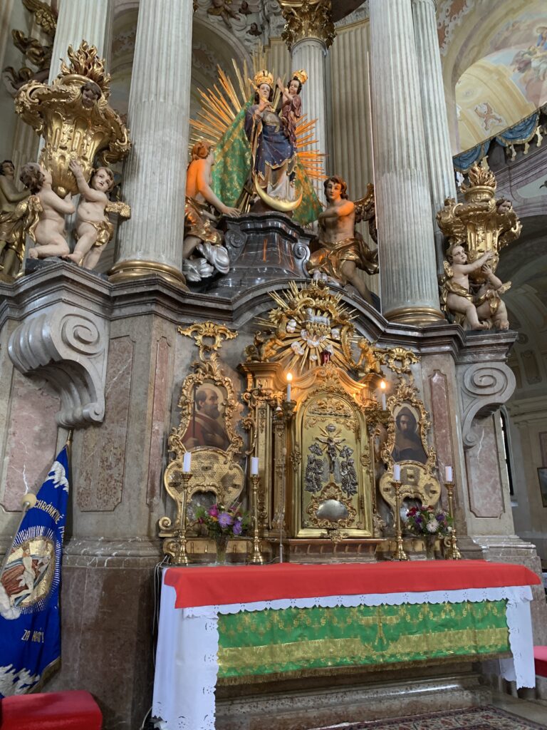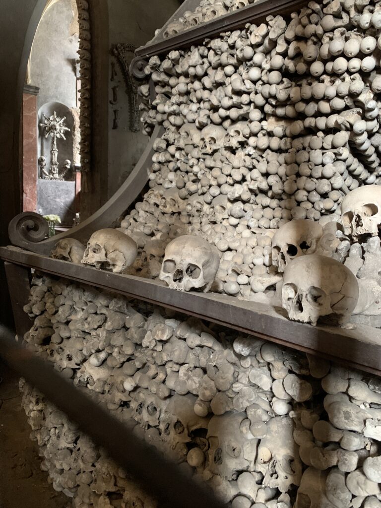 Również coś z grozy miało kolejne miejsce na naszej mapie podroży. Chodzi mianowicie o Kutną Horę z jej słynną Kaplicą Czaszek. My, Polacy mamy swoją taką koło Kudowy, a Czesi mają swoją w Kutnej Horze. Niestety nasza to „uboga krewna” tej czeskiej. Czesi swoją zrobili z większym rozmachem, ale przy tym z większym brakiem szacunku do ludzkich szczątków. W naszej te kości, choć ich mniej i zgromadzone w jednym miejscu, jednak jakoś godnie czekają na zmartwychwstanie. A Czesi – profani – zrobili z nich albo żyrandol, albo herb szlachecki, a nawet – o zgrozo – coś co chyba miało być monstrancją! No, ale czego oczekiwać od narodu, który już dawno pogrzebał swą wiarę i jest obecnie bodaj najbardziej zlaicyzowanym krajem w Europie… I pomyśleć, że od nich przejęliśmy kiedyś chrześcijaństwo…