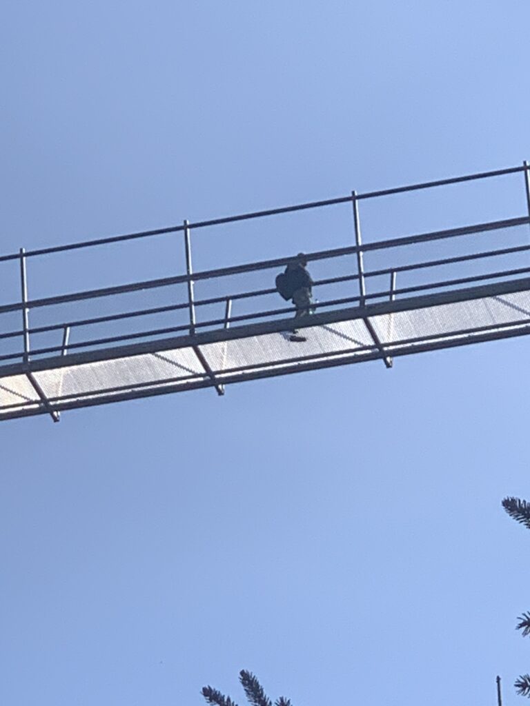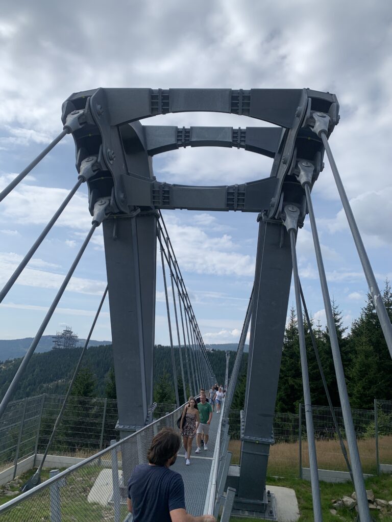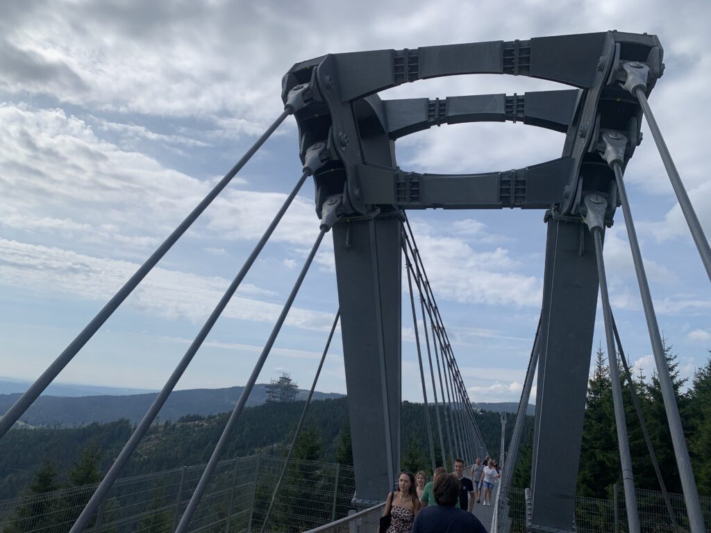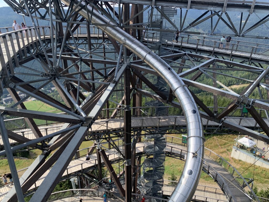 Niedaleko tej kładki znajduje się również tzw. „ścieżka w obłokach” o długości 710 m. Jest to „ślimakowa” wieża widokowa, osiągająca 55 m nad ziemią. (Nawiasem mówiąc podobna jak u nas w Krynicy. Nasza jest 6 metrów niższa, ale za to ponad kilometr dłuższa! Słowacy też mają taką swoją w Bachledowej Dolinie w Tatrach. Jest ona jednak mniejsza. A my mamy jeszcze inne np. „Brama w Gorce” w Waksmundzie koło Nowego Targu). Obie atrakcje udało nam się „zaliczyć”, choć trochę trzeba było się „nachodzić” tego dnia. Dla tych co chcieli by to zobaczyć przydatna wskazówka: warto kupić bilety przez internet, bo znacznie taniej.